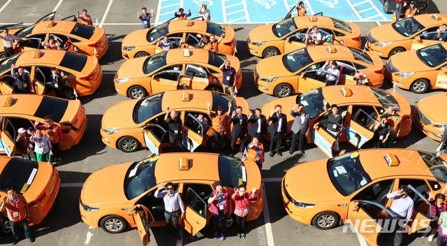 【서울=뉴시스】 12일 서울 구로구청 앞에서 열린 '청춘택시 신바람 나들이' 행사 참석자들이 출발 전 기념촬영을 하고 있다.