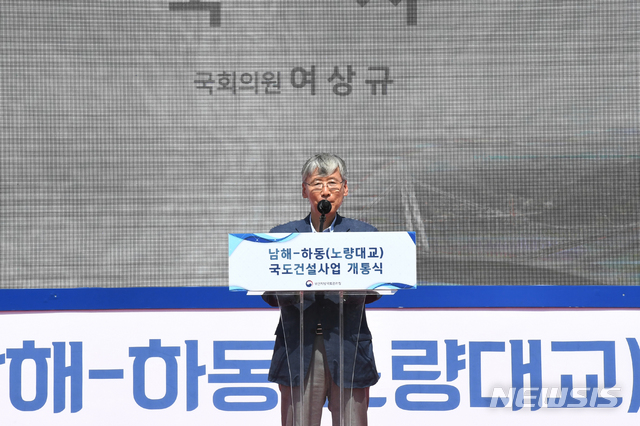 【하동=뉴시스】차용현 기자 = 12일 오전 경남 하동군 금남면 일원에서 개최된 노량대교 개통식에 참석한 여상규 법제사법위원장이 축사를 하고 있다. 2018.09.12.