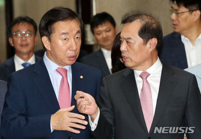 【서울=뉴시스】홍효식 기자 = 김병준(오른쪽) 자유한국당 비상대책위원장이 12일 오후 서울 여의도 국회에서 열린 부동산대책 관련 긴급 기자간담회에 참석하며 김성태 원내대표과 대화를 나누고 있다. 2018.09.12.