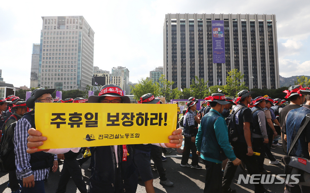 【서울=뉴시스】최진석 기자 = 전국건설노조 조합원들이 12일 오후 서울 중구 세종대로에서 '고용노동부 포괄임금 지침 폐기를 위한 건설노동자 총력투쟁 결의대회'를 마친 뒤 청와대를 향해 행진하고 있다. 2018.09.12.