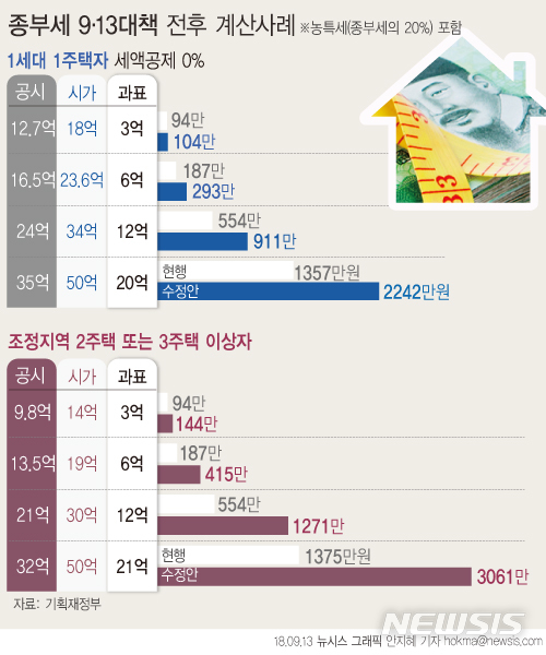 【서울=뉴시스】안지혜 기자 = 정부가 13일 발표한 '9·13 부동산 대책'이 시행되면 18억원(공시가격 12억7000원)짜리 집 한 채를 가진 1주택자의 종합부동산세(종부세) 부담이 올해보다 10만원 늘어나게 된다.