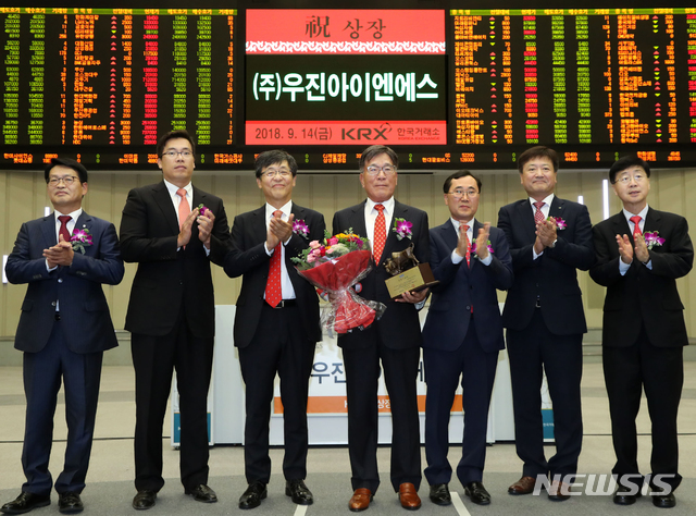 【서울=뉴시스】 한국거래소 유가증권시장본부는 14일 오전 서울 여의도 한국거래소 서울사옥 홍보관에서 반도체 디스플레이용 불소수지 코팅덕트와 일반건물용 덕트를 생산 및 시공하는 우진아이엔에스의 유가증권시장 신규상장기념식을 개최했다.