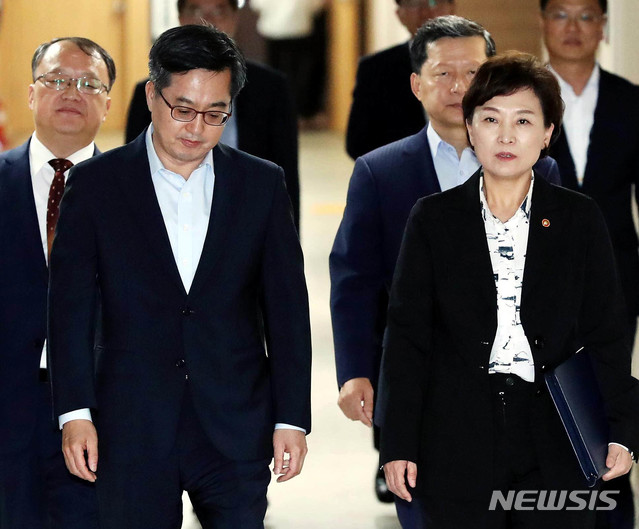 【서울=뉴시스】박주성 기자 = 김동연 경제부총리을 비롯한 관계부처 장관들이 13일 서울 세종로 정부서울청사에서 9.13 부동산대책을 발표하기 위해 입장하고 있다. 2018.09.15.