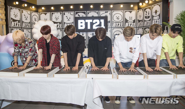【서울=뉴시스】 11일(현지시각) 미국 LA 할리우드 라인프렌즈 팝업스토어에 방문한 방탄소년단 멤버들이 핸드 프린팅을 하고 있다.