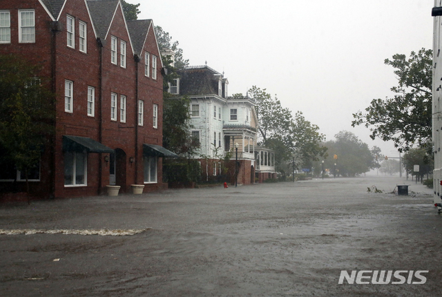 【뉴베른(노스 캐롤라이나주)=AP/뉴시스】허리케인 플로렌스가 상륙한 미 노스 캐롤라이나주 뉴베른 중심부가 14일 폭풍해일로 인해 바닷물이 밀려들면서 물에 잠겨 있다. 플로렌스는 미 동남부 7개 주에 체서피크만의 바닷물 전체와 비슷한 18조 갤런(약 681억3740만㎥)의 엄청난 폭우를 쏟아부을 것으로 예상된다. 2018.9.15
