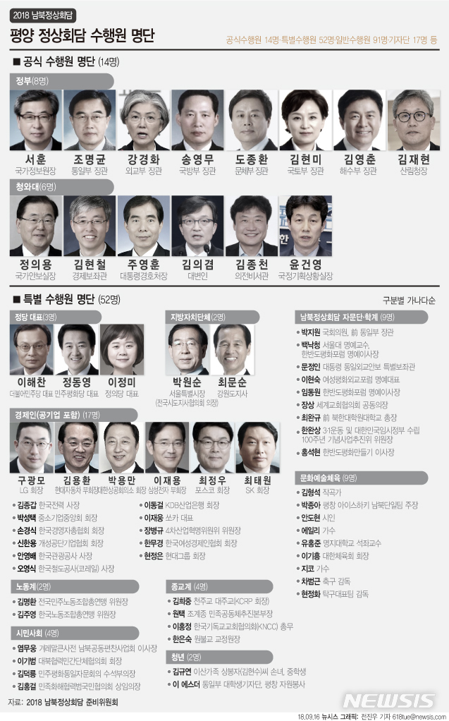 【서울=뉴시스】전진우 기자 = 남북 정상회담 준비위원장을 맡고 있는 임종석 대통령 비서실장은 16일 문재인 대통령을 수행해 평양 남북 정상회담에 동행할 수행원 명단을 최종 확정 발표했다. 다음은 평양 정상회담 수행원 명단.