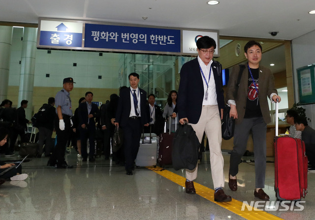 【파주=뉴시스】박주성 기자 = 3차 남북정상회담 선발대가 16일 오전 경기도 파주시 남북출입사무소로 출경하고 있다.