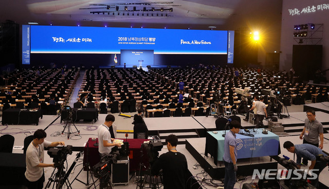 【서울=뉴시스】추상철 기자 = '평화, 새로운 미래'를 슬로건으로 한 3차 남북정상회담을 이틀 앞둔 16일 오후 문을 연 서울 중구 동대문디자인플라자(DDP)에 마련된 서울 프레스 센터에서 세계 각국 취재진들이 취재장비를 설치하고 있다. 2018.09.16.