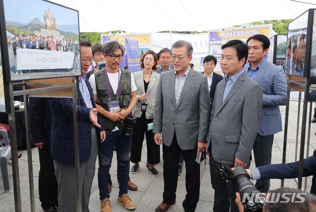 【서울=뉴시스】전신 기자 = 문재인 대통령이 16일 오후 서울 종로구 광화문 광장 일대에서 열린 2018 실패박람회를 방문해 실패했다 재기한 희망의 프레임 사진전을 관람하고 있다. 2018.09.16.