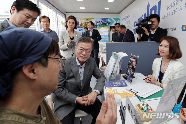 【서울=뉴시스】전신 기자 = 문재인 대통령이 16일 오후 서울 종로구 광화문 광장 일대에서 열린 2018 실패박람회를 방문해 참가자들과 대화하고 있다. 2018.09.16.