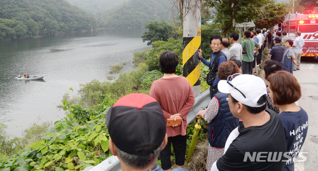 【완주=뉴시스】 김얼 기자 = 16일 3시 29분께 전북 완주군 동상저수지 인근에 경비행기가 추락한 가운데 인근 주민들이 저수지를 바라보고 있다. 2018.09.16
