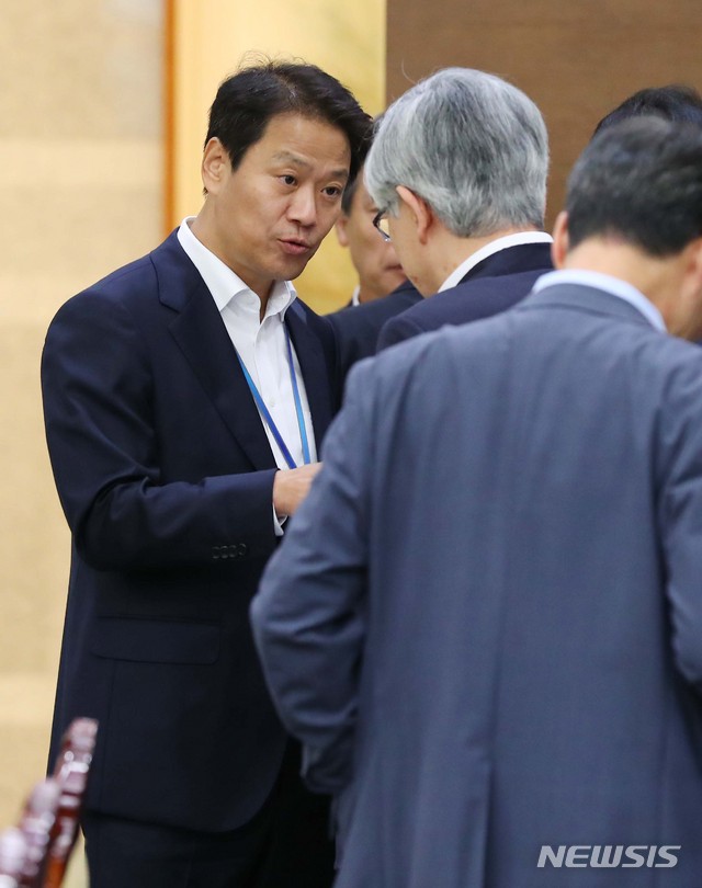 【서울=뉴시스】전신 기자 = 임종석 비서실장과 남관표 국가안보실 2차장이 17일 청와대 여민관에서 열린 수석보좌관회의에 앞서 대화하고 있다. 2018.09.17. [email protected]