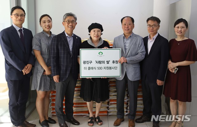 【서울=뉴시스】 학교법인 건국대학교가 운영하는 프리미엄 시니어 타운 더 클래식 500의 자원봉사단이 17일 광진구 자양제3동주민센터를 방문해 지역 내 저소득 이웃 80 가구에게 ‘사랑의 쌀’을 후원했다. 2018.09.18. (사진=더클래식500 제공)