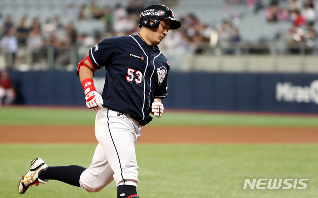 【서울=뉴시스】추상철 기자 = 18일 오후 서울 구로구 고척스카이돔에서 열린 2018 KBO리그 두산베어스와 넥센히어로즈의 경기. 1회초 1사 주자없는 상황에서 홈런을 때린 최주환이 그라운드를 돌고 있다. 2018.09.18.