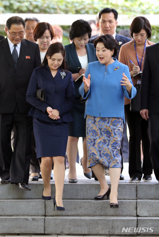 【평양=뉴시스】평양사진공동취재단 박진희 기자 = 문재인 대통령 부인 김정숙 여사와 김정은 국무위원장 부인 리설주 여사가 18일 오후 평양 음악종합대학을 방문해 대화하며 이동하고 있다. 2018.09.18.