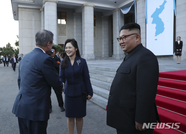 【평양=뉴시스】평양사진공동취재단 박진희 기자 = 문재인 대통령이 18일 오후 평양대극장 입구에서 김정은 국무위원장과 부인 리설주 여사와 인사를 나누고 있다. 2018.09.19.