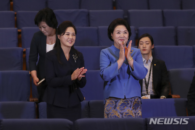 【평양=뉴시스】평양사진공동취재단 박진희 기자 = 문재인 대통령 부인 김정숙 여사와 김정은 국무위원장 부인 리설주 여사가 18일 오후 평양 김원균명칭 음악종합대학을 방문해 오케스트라 공연을 관람하고 있다. 2018.09.19.