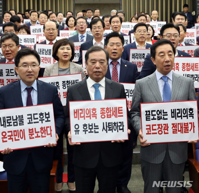 【서울=뉴시스】박영태 기자 = 19일 오후 서울 영등포구 여의도 국회에서 진행된 자유한국당 긴급 의원총회에서 김병준 비대위원장, 김성태 원내대표 등 의원들이 문재인 정부를 비판하는 피켓을 들고 구호를 외치고 있다. 2018.09.19.