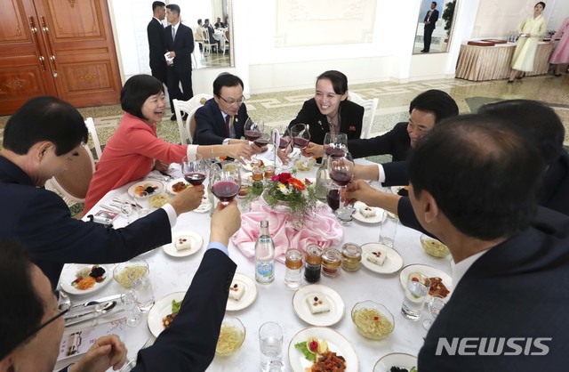 【평양=뉴시스】평양사진공동취재단 박진희 기자 = 19일 평양 옥류관에서 문재인 대통령 평양 방문 특별수행원으로 방북한 여야3당 대표가 김여정 노동당 선전선동부 제1부부장과 함께 건배하고 있다. 2018.09.19.