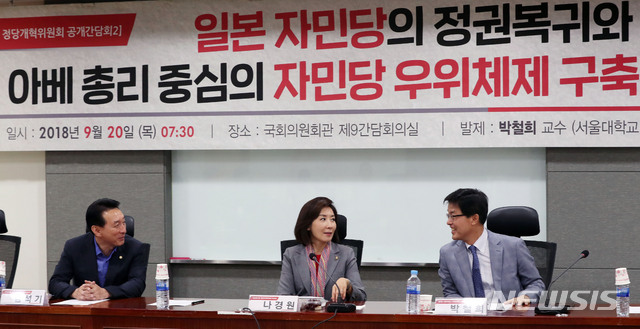 【서울=뉴시스】홍효식 기자 = 20일 오전 서울 여의도 국회 의원회관에서 열린 '일본 자민당의 정권복귀와 아베총리 중심의 자민당 우위체제 구축' 자유한국당 정당개혁위원회 공개 간담회에서 나경원, 김석기 의원과 박철희 서울대 국제대학원 교수가 대화를 나누고 있다. 2018.09.20.