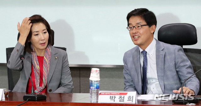 【서울=뉴시스】홍효식 기자 = 20일 오전 서울 여의도 국회 의원회관에서 열린 '일본 자민당의 정권복귀와 아베총리 중심의 자민당 우위체제 구축' 자유한국당 정당개혁위원회 공개 간담회에서 나경원 의원과 박철희 서울대 국제대학원 교수가 대화를 나누고 있다. 2018.09.20.