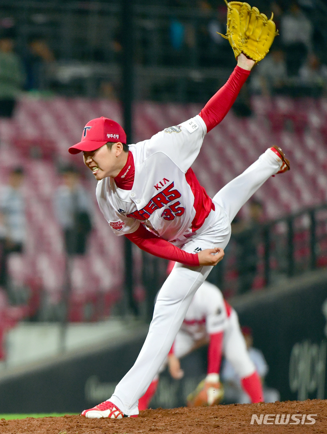 【광주=뉴시스】류형근 기자 = 20일 오후 광주 북구 광주-기아챔피언스필드에서 열린 2018프로야구 KIA 타이거즈 대 NC 다이노스의 경기, 9회초 무사에서 마운드에 올라온 KIA 바뀐투수 문경찬이 역투하고 있다. 2018.09.20.
