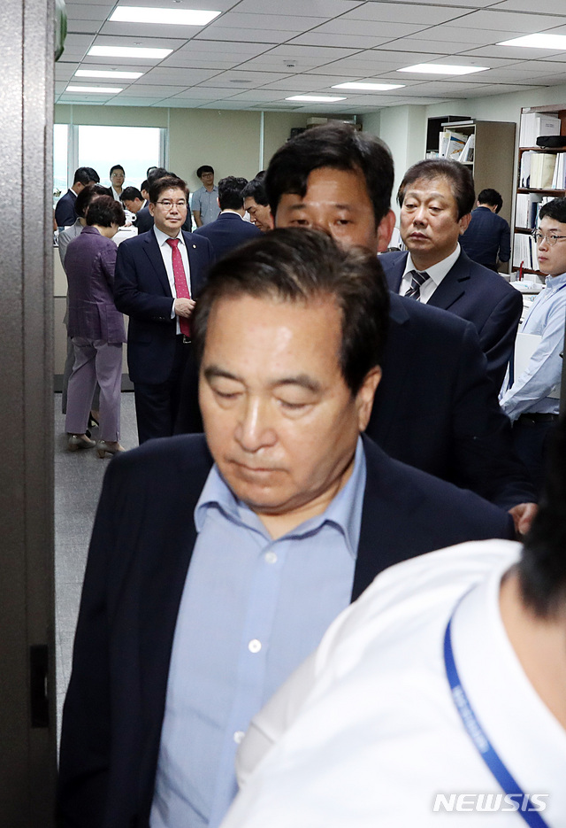 【서울=뉴시스】이종철 기자 = 21일 오전 서울 여의도 국회 의원회관 자유한국당 심재철 의원 사무실에서 검찰이 '예산 정보 무단 열람·유출' 혐의로 압수수색을 하자 심재철 의원이 심각한 표정으로 자신의 사무실을 나오고 있다. 심 의원 뒤로 검찰이 압수수색 하는 모습이 보인다. 2018.09.21.