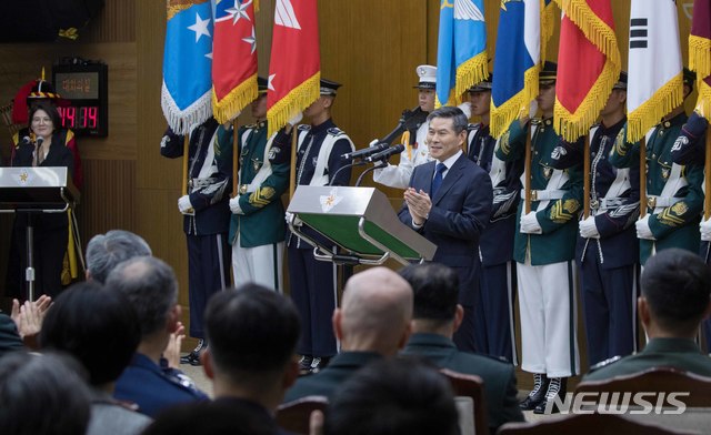 【서울=뉴시스】고승민 기자 = 정경두 신임 국방부 장관이 21일 오후 서울 용산구 국방부 장관실에서 이임한 송영무 전 장관을 향해 박수를 치고 있다. 2018.09.21.