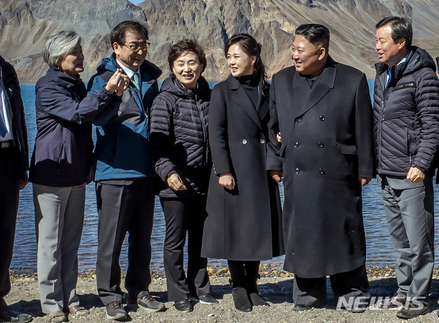 【백두산=뉴시스】평양사진공동취재단 박진희 기자 = 20일 백두산 천지에서 김정은 위원장 내외가  남쪽 수행원들과 기념사진을 찍고 있다. 처음에는 손을 내리고 있었으나, 강경화 외교부 장관으로부터 "남쪽에서 유행하는 손가락 하트를 해보자"는 제안을 받고, 따라하고 있다. 리설주 여사는 김 위원장의 손을 받치고 있다. 2018.09.23. (사진=청와대 제공)