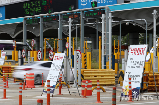 【성남=뉴시스】이영환 기자 = 추석을 하루 앞둔 23일 오전 경기 성남시 궁내동 경부고속도로 서울요금소에 통행료 면제 안내판이 게시되어 있다. 2018.09.23.