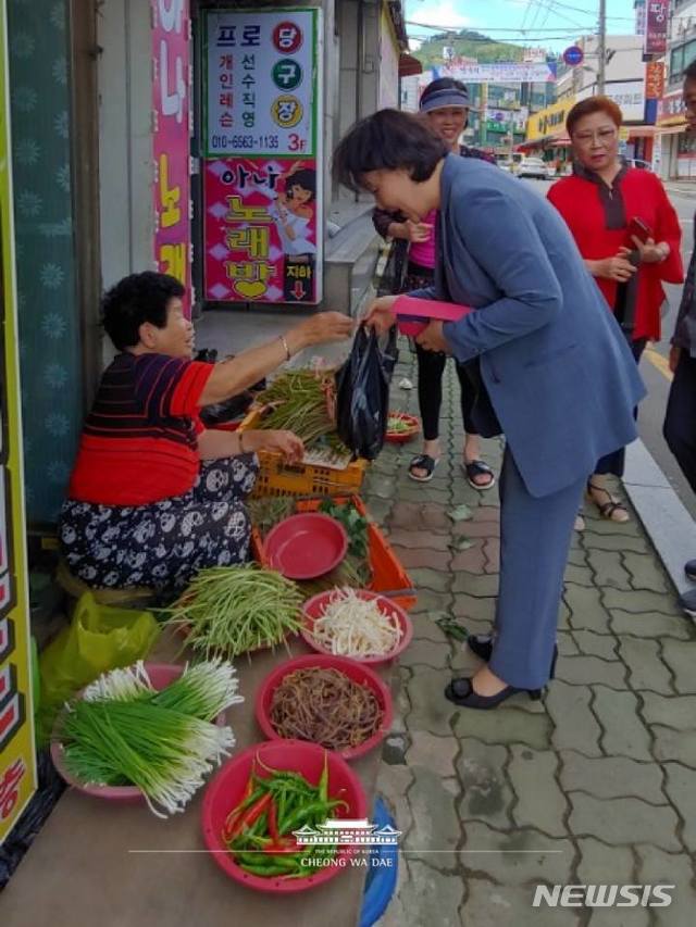 청와대는 "경남 양산 덕계상설종합시장을 찾은 김정숙 여사. 노점 할머니가 파시는 가지를 구입했습니다. 할머니의 좌판에 쪽파와 고구마순, 고사리, 도라지가 깔끔하게 다듬어져 있네요. 가을 별미인 가지는 살짝 데쳐 나물로 무쳤습니다."라고 밝혔다. 2018.09.23. (사진=청와대 페이스북 제공)