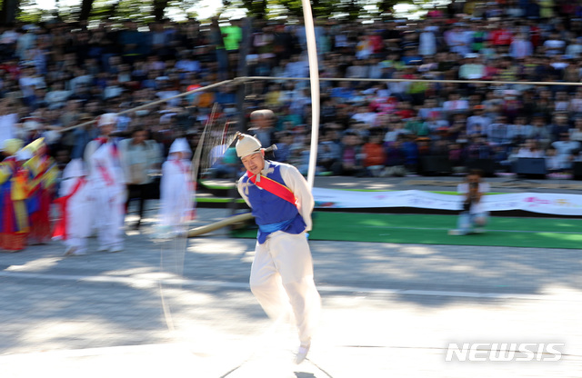 【서울=뉴시스】 이영환 기자 = 추석인 24일 오후 서울 용산구 남산공원 팔각정에서 열린 2018 남산축제 추석 한가위 시민과 함께하는 전통줄타기 판줄 '연희야 놀자'에서 많은 시민들이 관람하는 가운데 유네스코 인류무형문화유산 국가무형문화재 11-2호 평택농악 공연이 진행되고 있다. 2018.09.24.