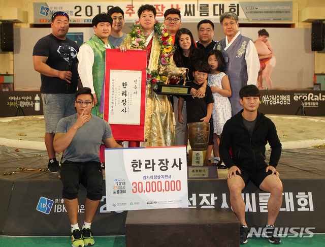 【서울=뉴시스】 김진아 기자 = 24일 경북 문경시 문경실내체육관에서 열린 ‘IBK기업은행 2018 추석장사씨름대회’ 한라장사(105kg이하)에 등극한 손충희(울산동구청)와 울산동구청 선수단이 기념촬영을 하고 있다. 2018.09.24. (사진=대한씨름협회 제공)