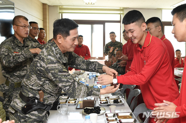 【서울=뉴시스】 김진아 기자 = 전진구 해병대사령관이 25일 서해 NLL 최북단인 연평도·우도를 방문해 전역을 앞둔 병장들에게 손목시계를 선물하고 있다. 2018.09.25. (사진=해병대사령부 제공)