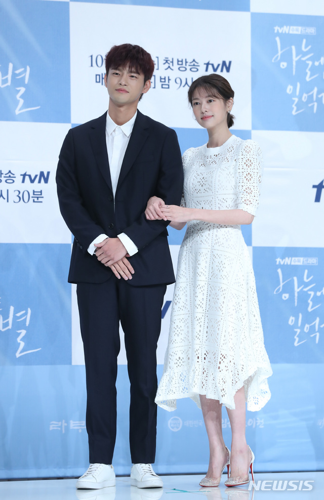 【서울=뉴시스】조수정 기자 = 배우 서인국, 정소민(오른쪽)이 tvN 수목드라마 '하늘에서 내리는 일억개의 별' 제작발표회가 열린 28일 오후 서울 영등포 타임스퀘어에서 포즈를 취하고 있다. '하늘에서 내리는 일억개의 별'은 10월 3일 밤 9시 30분 첫 방송된다. 2018.09.28. [email protected]