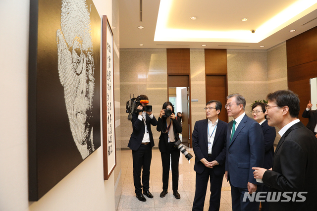 【서울=뉴시스】박진희 기자 = 문재인 대통령이 1일 오후 청와대 여민관에서 열린 수석·보좌관 회의 참석에 앞서 이동재 작가의 '아이콘_김구' 작품과 백범 김구 선생의 '답설야중거(踏雪野中去)' 친필 글씨를 감상하고 있다.