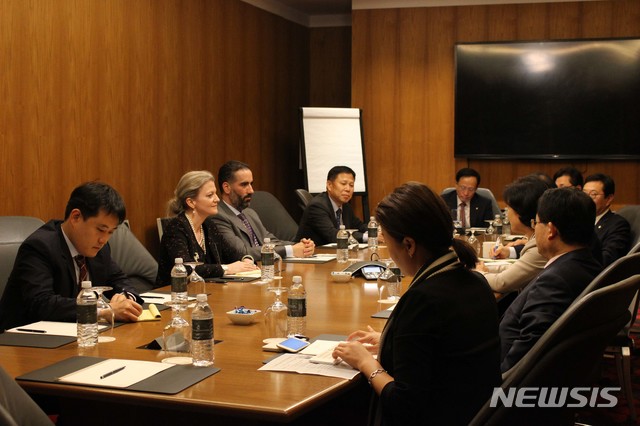 【서울=뉴시스】 미국을 방문중인 더불어민주당 대미특사단이 1일(현지시각) 앨리슨 후커 백악관 NSC 한반도 보좌관과 면담을 하고 있다. 2018.10.02. (사진=더불어민주당 제공)