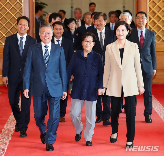 【서울=뉴시스】전신 기자 = 문재인 대통령이 2일 청와대 본관에서 유은혜 사회부총리 겸 교육부 장관에게 임명장을 수여한 후 환담장으로 이동하고 있다. 가운데는 유 사회부총리 시어머니 정종석씨. 2018.10.02.