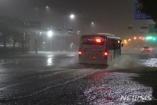 【제주=뉴시스】배상철 기자 = 제25호 태풍 '콩레이'가 근접하고 있는 5일 오후 제주공항 인근 도로가 물에 잠겨 차량 통행에 어려움을 겪고 있다. 사진은 잠긴 도로를 노선 버스가 도로위 물을 가르며 지나가고 있다. 2018.10.05.
