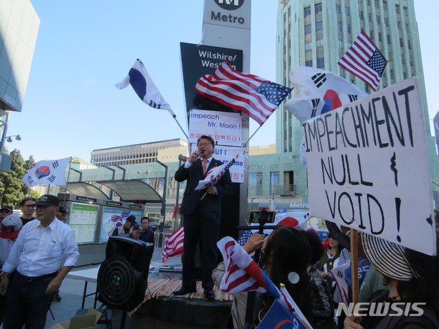 【L.A(미국)=뉴시스】 김운영 편집위원 = LA 코리아타운 윌셔-서부웨스턴 메트로 지하철 입구지하철입구 광장에서 4일(현지시각) 대대적인 태극기 집회가 열렸다.