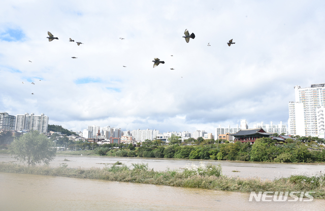 【울산=뉴시스】배병수 기자 = 제25호 태풍 '콩레이'이 한반도를 향해 북상한 6일 오후 집중호우로 울산시 중구 태화강이 범람하고 있다. 2018.10.06.