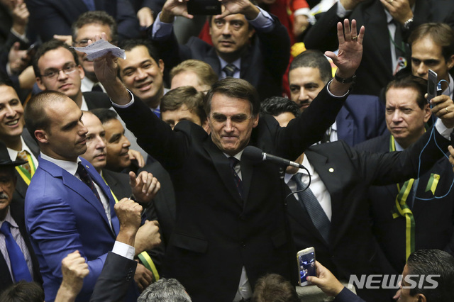 【브라질리아=AP/뉴시스】브라질에서 7일 대통령선거가 치러진다. 사진은 지지율 1위의 자이르 보우소나루 후보가 지난 2017년 4월 18일 브라질리아 국회의사당에서 지우마 호세프 당시 대통령의 탄핵 찬성 의사를 나타낸 후 양팔을 들어올려 환호하는 보우소나루의 모습. 2018.10.07