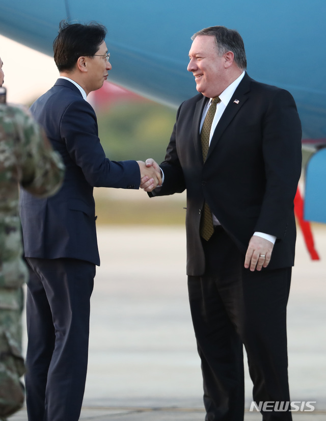 【서울=뉴시스】사진공동취재단 = 마이크 폼페이오 미국 국무장관이 7일 오후 경기도 평택시 오산공군기지를 통해 입국해 김태진 외교부 북미국장과 악수를 하고 있다.