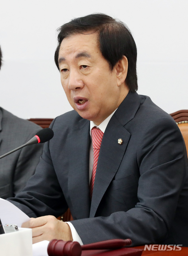 【서울=뉴시스】박영태 기자 = 8일 오전 서울 영등포구 여의도 국회에서 열린 자유한국당 비상대책위원회의에서 김성태 원내대표가 발언하고 있다. 2018.10.08. [email protected]