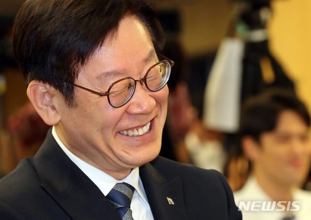 【서울=뉴시스】박영태 기자 = 8일 오전 서울 영등포구 여의도 국회 의원회관에서 열린 기본소득형 국토보유세 토론회에서 이재명 경기도지사가 밝게 웃고 있다. 2018.10.08.