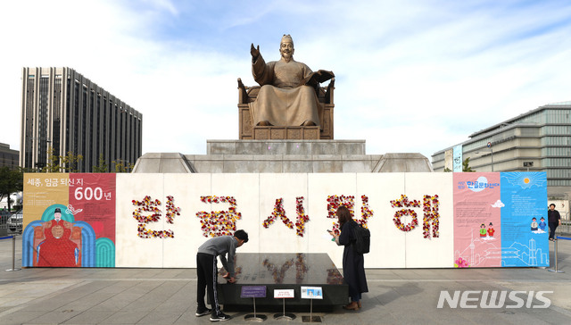 【서울=뉴시스】김선웅 기자 = 572돌 한글날을 하루 앞둔 8일 오후 서울 종로구 광화문광장의 한 벽면에 '한글사랑해' 꽃장식이 되어있다. 2018년은 한글을 창제한 세종대왕 즉위 600주년을 맞는 해 이다. 2018.10.08.