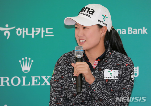 【서울=뉴시스】최동준 기자 = 8일 인천 영종도 스카이72 골프앤리조트 오션코스에서 열린 '2018 LPGA KEB하나은행챔피언십' 공식 기자회견에서 이민지가 질문에 답변하고 있다. 2018.10.08. (사진=LPGA KEB하나은행챔피언십 대회본부 제공)