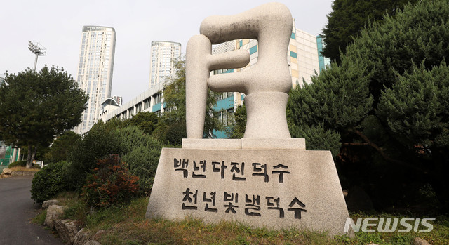 【서울=뉴시스】추상철 기자 = 9일 오전 분할 이전이 본격 추진되는 서울 성동구 덕수고등학교에는 '백년 다진 덕수', '천년 빛낼 덕수'라고 적힌 비석이 세워져 있다.