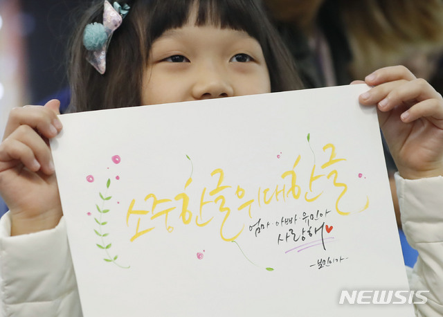 【서울=뉴시스】최동준 기자 = 9일 서울 중구 시민청에서 열린 '2018 한글, 서울을 움직이다' 행사에서 한 어린이가 한글 캘리그라피를 들고 기념사진을 찍고 있. 2018.10.09.
