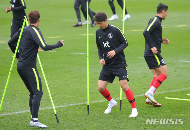 【파주=뉴시스】배훈식 기자 = 우루과이와의 평가전을 앞두고 소집된 축구 국가대표 기성용(왼쪽 두번째) 등이 9일 오후 경기 파주시 파주NFC(국가대표 트레이닝 센터)에서 훈련하고 있다. 2018.10.09.